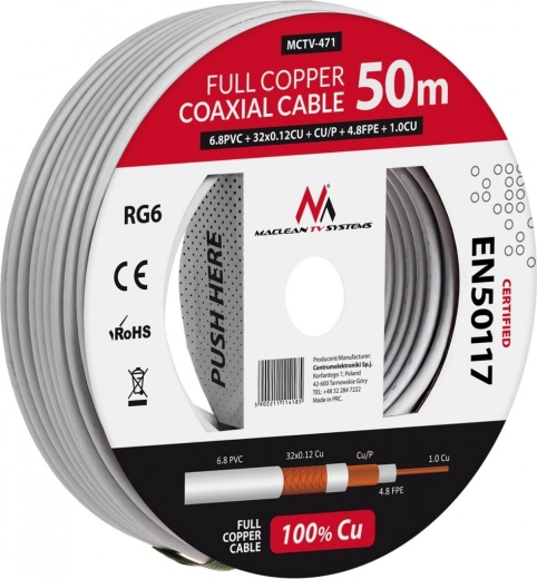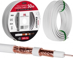 Kiváló minőségű koaxiális kábel RG6, teljes hossz 50 méter, garantálja a kiváló jelátvitelt zavartalanul, még hosszú telepítések esetén is.