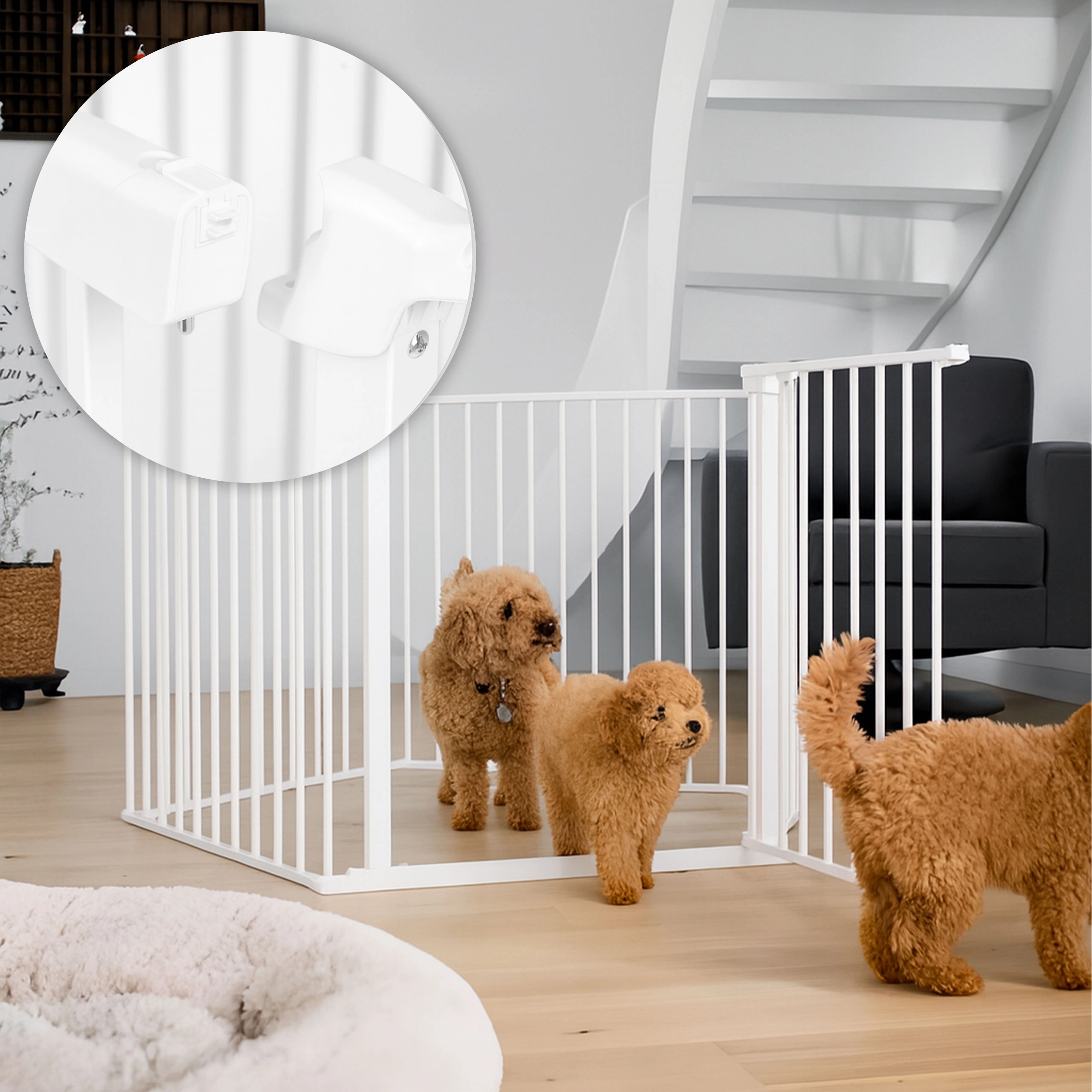 Ez a biztonsági korlát ideális kutyatulajdonosok számára is. Az állítható panelekkel zárt teret lehet kialakítani.