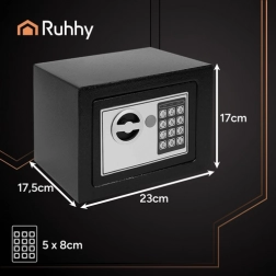 A kompakt RUHHY széf megóvja értékeit a elektronikus kódzár, a 3 hibás próbálkozás utáni automatikus blokkolás és a vésznyitás kulccsal funkcióknak köszönhetően. Ideális otthonra, irodába és szállodába, strapabíró acélból készült, fény- és hangjelzéssel, valamint falra szerelési lehetőséggel.