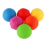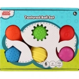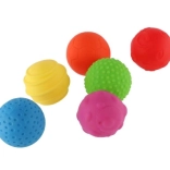 A legkisebbeknek szánt, színes, hat darabból álló puha labdakészlet különböző textúrákkal támogatja a finom- és nagymozgások fejlődését, a érzékelést és a tapintásos felfedezést. Minden labdának más a felülete és a színe, megnyomásra sípol, és egészségre ártalmatlan. Remek a mozgás ösztönzésére és a játékos tanuláshoz.