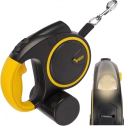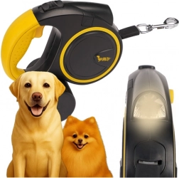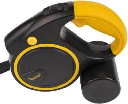 Praktikus, 5 m hosszú automata póráz 10–25 kg tömegű kutyáknak. Kínál erős és tartós szalagot, azonnali kontrollt a STOP féknek köszönhetően, ergonomikus fogantyút és beépített LED lámpát a biztonságos sétákhoz szürkületben. Tartozék zacskótartó és minőségi forgó karabiner a csavarodás ellen.