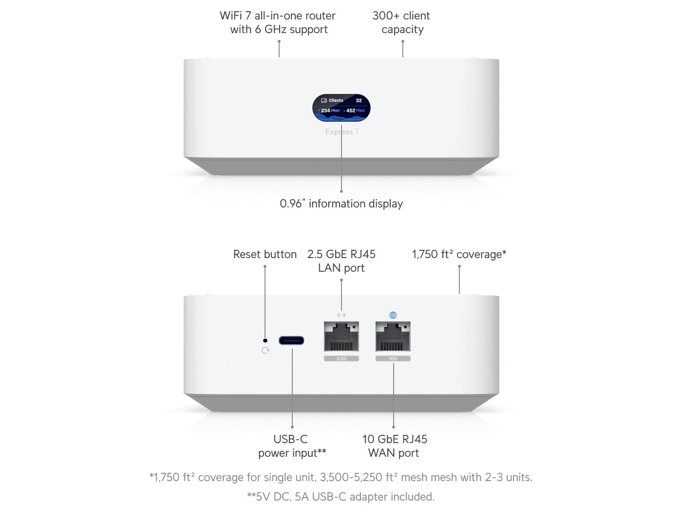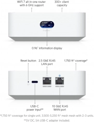 Az UNI FI Express 7 egyesíti a nagy teljesítményű biztonsági átjárót, a hálózatvezérlőt és a vezeték nélküli hozzáférési pontot egy elegáns eszközben. Az integrált Wi‑Fi 7 rendkívül gyors, alacsony késleltetésű kapcsolatot biztosít, míg a mesh topológia támogatása egyszerűvé teszi a jel kiterjesztését az egész épületben.