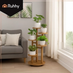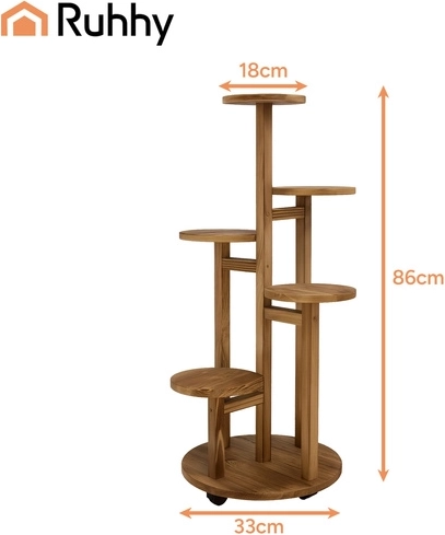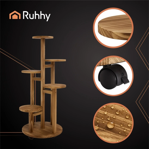 Stílusos és funkcionális RUHHY virágtartó állvány természetes fenyőfából, amely 6 szinten akár 7 virágcserepet fogad. Ideális nappaliba, erkélyre és teraszra – látványos növénybemutatást, helytakarékosságot és könnyű elrendezést biztosít. A fékezhető forgókerekeknek köszönhetően egyszerűen áthelyezhető és biztonságosan rögzíthető a kiválasztott helyen.