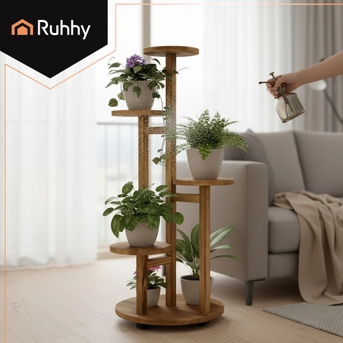 Vigyen rendet és zöldet az enteriőrbe a RUHHY állvány könnyű, mobil és praktikus kialakításával. A fékezhető forgókerekek sima mozgatást tesznek lehetővé a padló megkarcolása nélkül, míg a 6 szint helyet ad különböző méretű cserepeknek egy harmonikus kompozícióban. A természetes fenyőfa esztétikus, könnyen tisztítható és nedvességálló – kiváló beltérre és kültérre egyaránt.