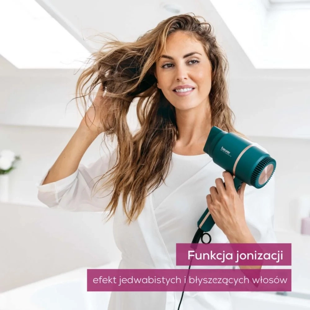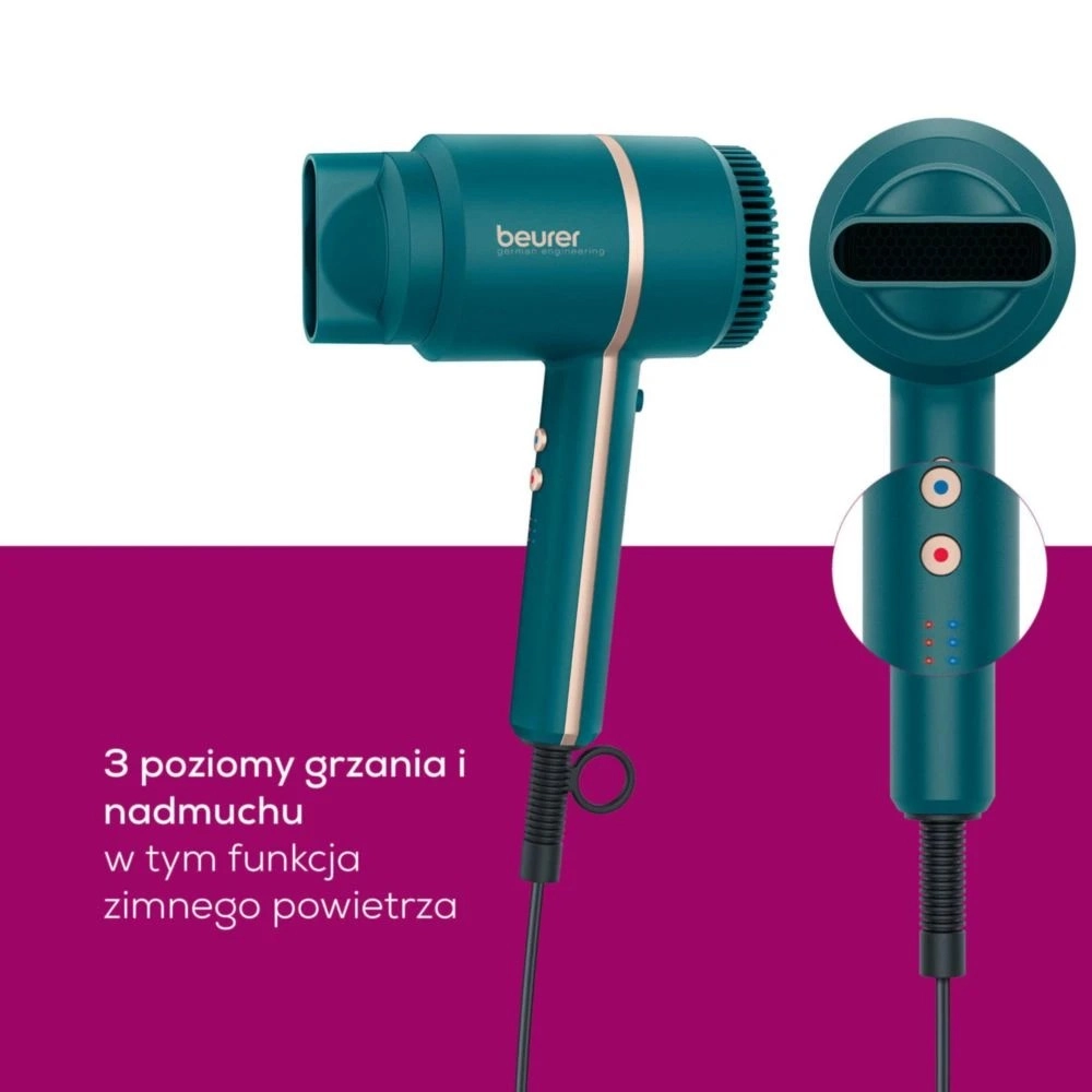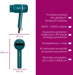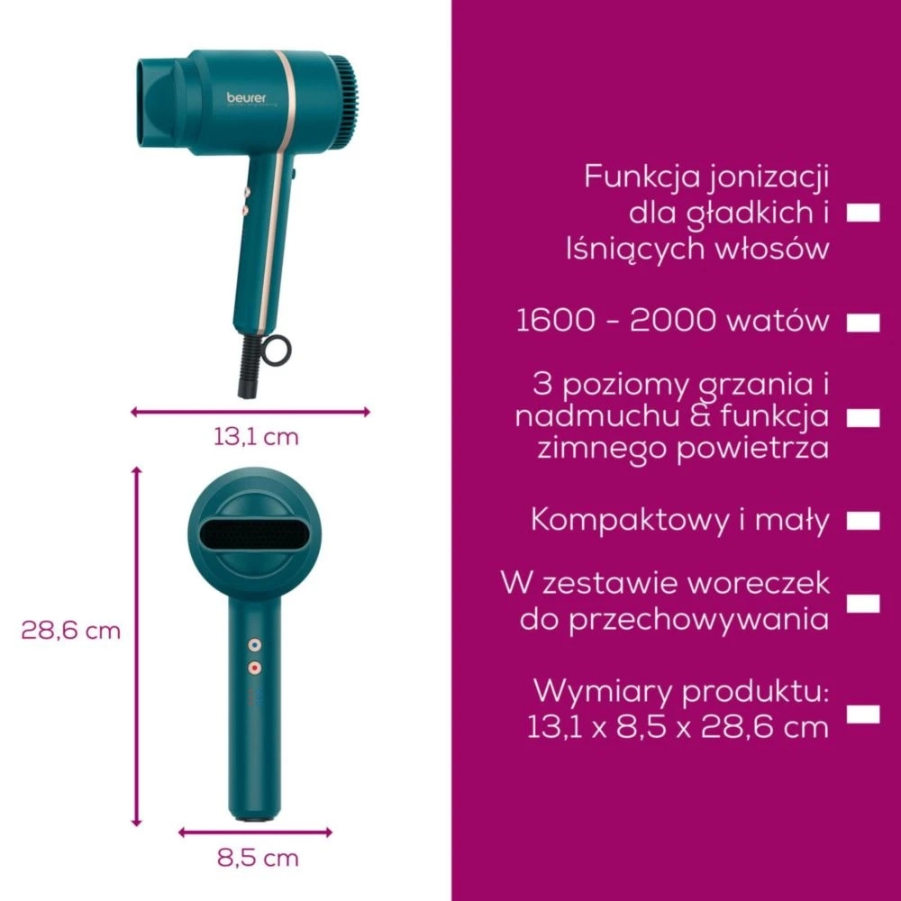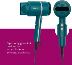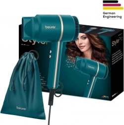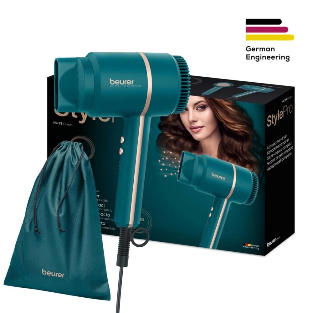 A Beurer HC 35 Ocean egy praktikus, kis méretű hajszárító, amely a modern dizájnt magas teljesítménnyel ötvözi. A kompakt méreteknek és a mellékelt tárolózsáknak köszönhetően ideális a fürdőszobába és utazáshoz egyaránt. Az integrált ionizáció csökkenti a göndörödést, fényt ad a hajnak és megkönnyíti a formázást.