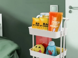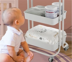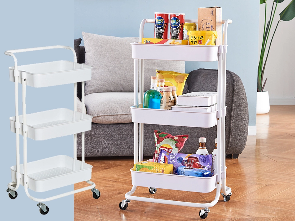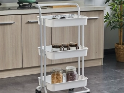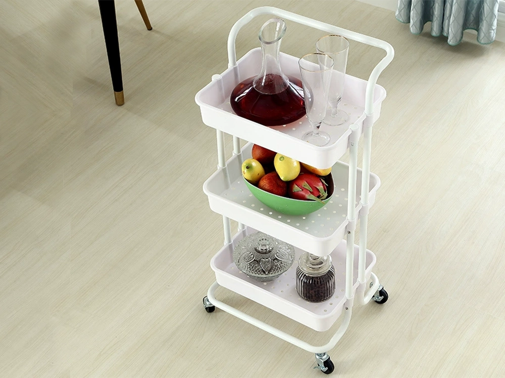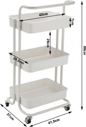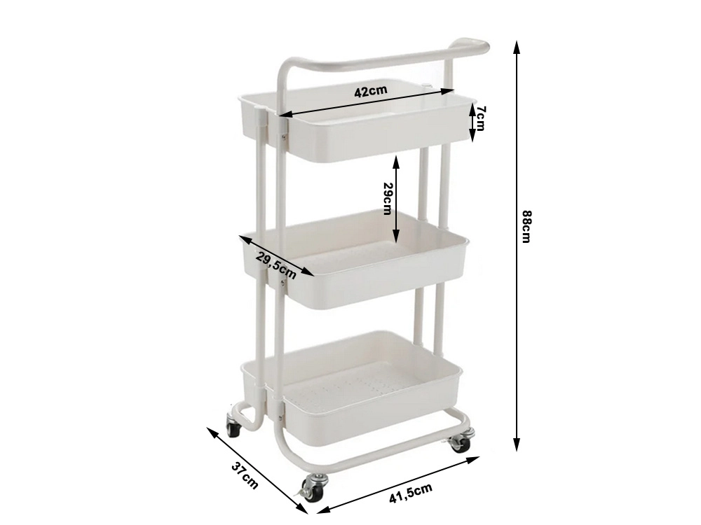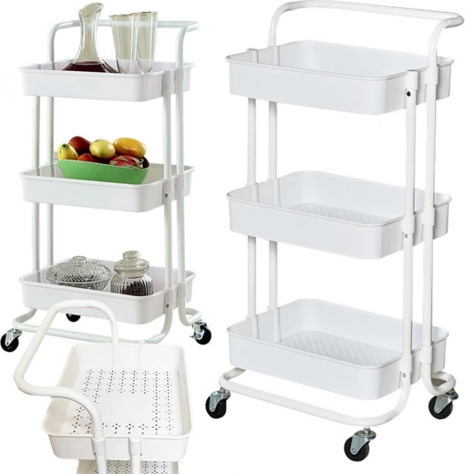 Az elegáns fehér, kerekeken guruló állvány a masszív fém vázat három mély polc funkcionalitásával ötvözi. Minden polc perforált alja elősegíti a légáramlást, ezért ideális élelmiszerekhez, kozmetikumokhoz és tisztítószerekhez. Kompakt méreteinek köszönhetően keskenyebb helyekre is befér, mégis meglepően nagy tárolóhelyet kínál.