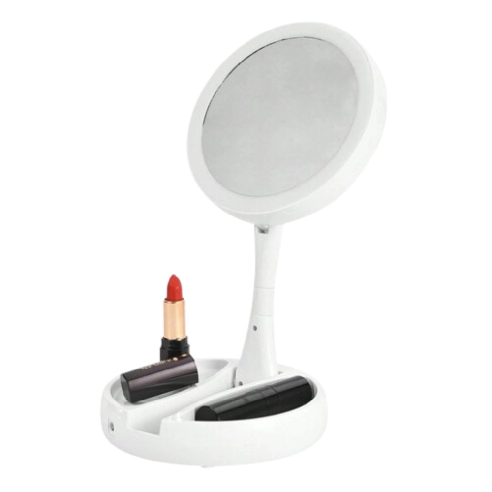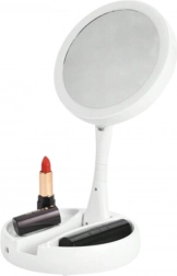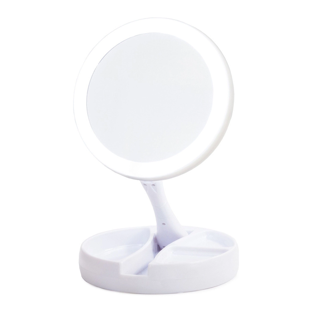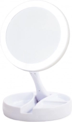 Elegáns asztali tükör LED megvilágítással és kétoldalas felülettel (1× és 10× nagyítás), ideális sminkeléshez, bőrápoláshoz és kontaktlencse felhelyezéséhez. A 180°-ban forgatható kialakításnak köszönhetően könnyen válthatsz oldal között, míg a praktikus szervező a talpban kéznél tartja a kozmetikumokat. Tápellátás 4× AA elemmel vagy MicroUSB kábellel a maximális kényelemért.