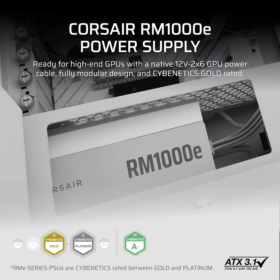 A Corsair RM1000e White igényes gamer és munkaállomás PC-khez készült, ahol a stabilitás, csend és hatékonyság alapkövetelmény. A modern ATX 3.1 és PCIe 5.1 szabványoknak köszönhetően könnyedén táplál nagy teljesítményű videokártyákat és processzorokat, míg a Cybenetics Gold minősítés magas hatásfokot és kifinomult működést garantál.