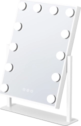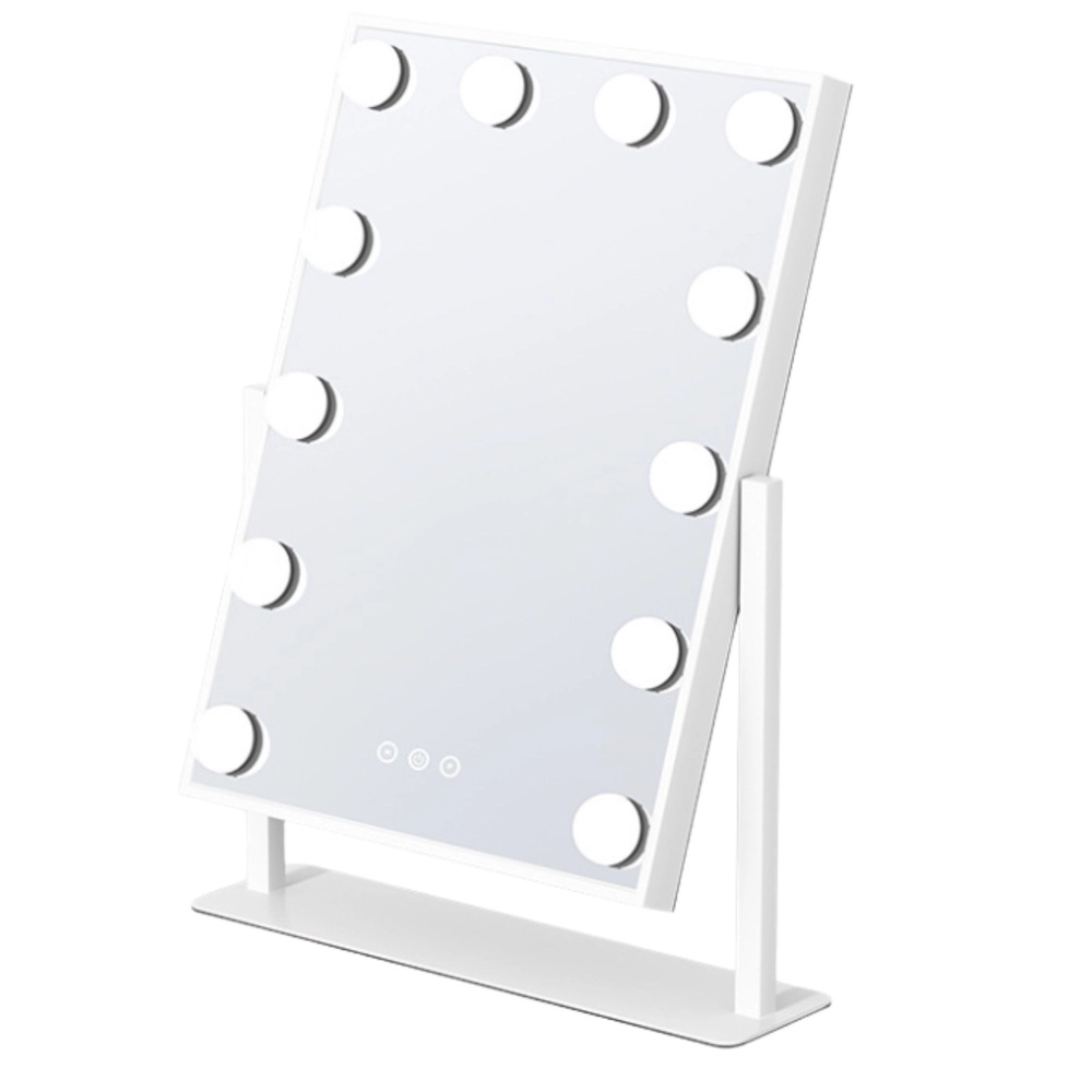 Elegáns hollywoodi tükör 12 LED izzóval, amely egyenletes és erős fényt biztosít a tökéletes sminkeléshez és frizurakészítéshez. Az érintőpanel 3 fény színt (meleg, semleges, hideg fehér) és fokozatmentes fényerő-szabályozást kínál memóriafunkcióval. A stabil fém konstrukció és a 360°-ban forgatható keret ideális szöget biztosít. Stílusos kiegészítő a fésülködőasztalhoz, fürdőszobába és szalonba.