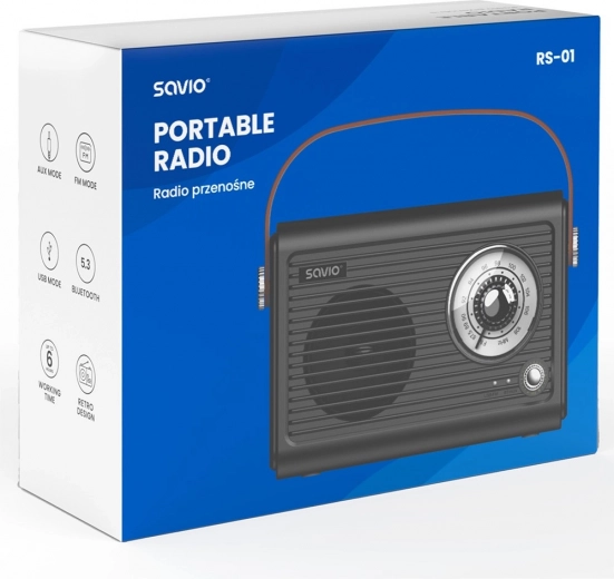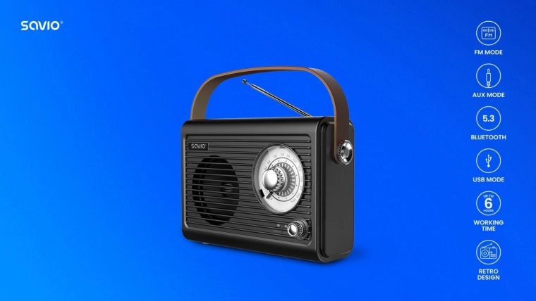 A kompakt és könnyű SAVIO RS‑101 hordozható rádió tiszta, kiegyensúlyozott hangzást nyújt otthon és útközben. A FM rádiónak, a Bluetooth 5.3‑nak, a AUX bemenetnek és a USB‑C töltésnek köszönhetően könnyedén hallgathatod kedvenc állomásaidat és zenéidet a telefonról. A kihúzható antenna stabil vételt biztosít, a beépített akkumulátor pedig akár 6 órányi hallgatást kínál az elegáns retro dizájnban.