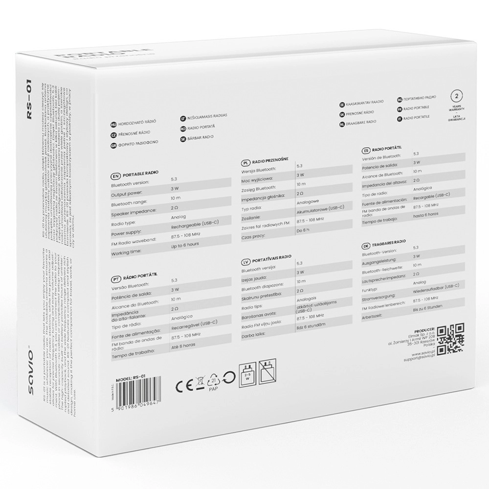 Élvezd a szabadságot kábelek nélkül. A Savio RS‑101 hordozható rádió a klasszikus analóg FM hangolást (87,5–108 MHz) ötvözi a modern Bluetooth 5.3 csatlakozással a vezeték nélküli lejátszáshoz okostelefonról, táblagépről vagy laptopról. A teleszkópos antenna segítségével magabiztosan hangolhatod be kedvenc állomásaidat, a forgatógombbal pedig pontosan finomhangolhatsz.