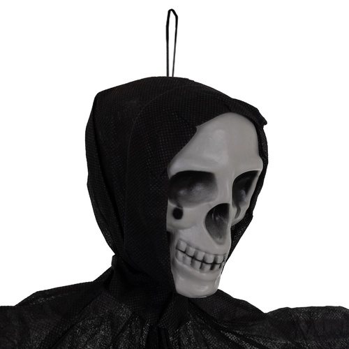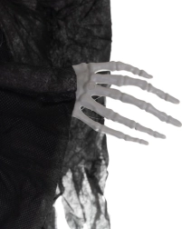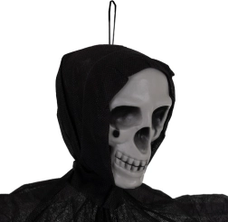 Realista, függeszthető csontváz tépett anyaggal, amely azonnal hátborzongató hangulatot teremt. Könnyű szerkezet és akasztófül a könnyű felhelyezéshez – mennyezetre, ajtóra, lámpára vagy kültéri előtető alá. A szélben mozgó textil lebegő kísértet hatást kelt, a 70 cm-es méret pedig feltűnő központi díszítőelemmé teszi. Ideális Halloweenre, tematikus bulikra és díszletezéshez.
