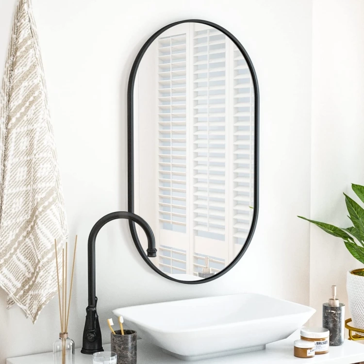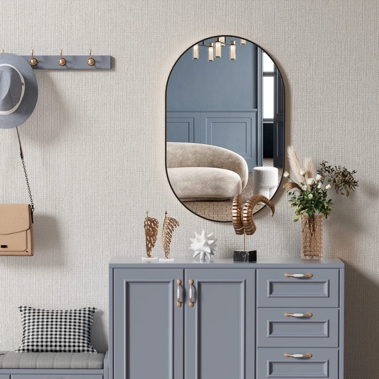 Az univerzális ovális tükör funkcionális és dekoratív elem, amely világosabbá és elegánsabbá teszi a teret. A nagy visszaverő felület ideális öltözet ellenőrzéséhez, sminkeléshez vagy a belső tér stílusos kiegészítéséhez. A vékony fekete alumínium keret kiemeli a minimalista, modern megjelenést, amely könnyen összehangolható különböző berendezési stílusokkal.