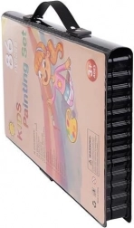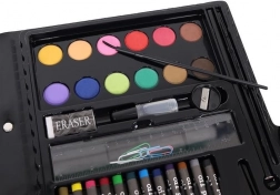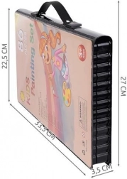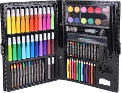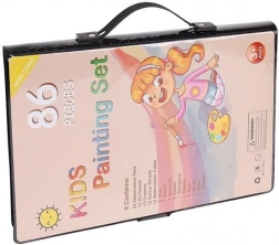 Festőkészlet 86 darabot tartalmaz, amelyek széles választékot nyújtanak rajzoláshoz és festéshez – 12 pasztellceruza, 24 erős filctoll, 12 olajpasztell, 12 viaszpasztell, 12 akvarell, szivacs, radír, ecset, olló, ceruza, hegyező, ragasztó, vonalzó, festőpaletta és 5 színes csipesz.
