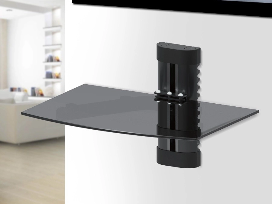 Stílusos fali polc edzett üveggel AV készülékekhez, amely biztonságos tárolást kínál DVD/BD lejátszókhoz, set-top boxokhoz vagy konzolokhoz egészen 8 kg-ig. Ötvözi az elegáns fekete üveget, a masszív fémkonzolt és az integrált kábelrendezést a letisztult, modern TV alatti megjelenésért.