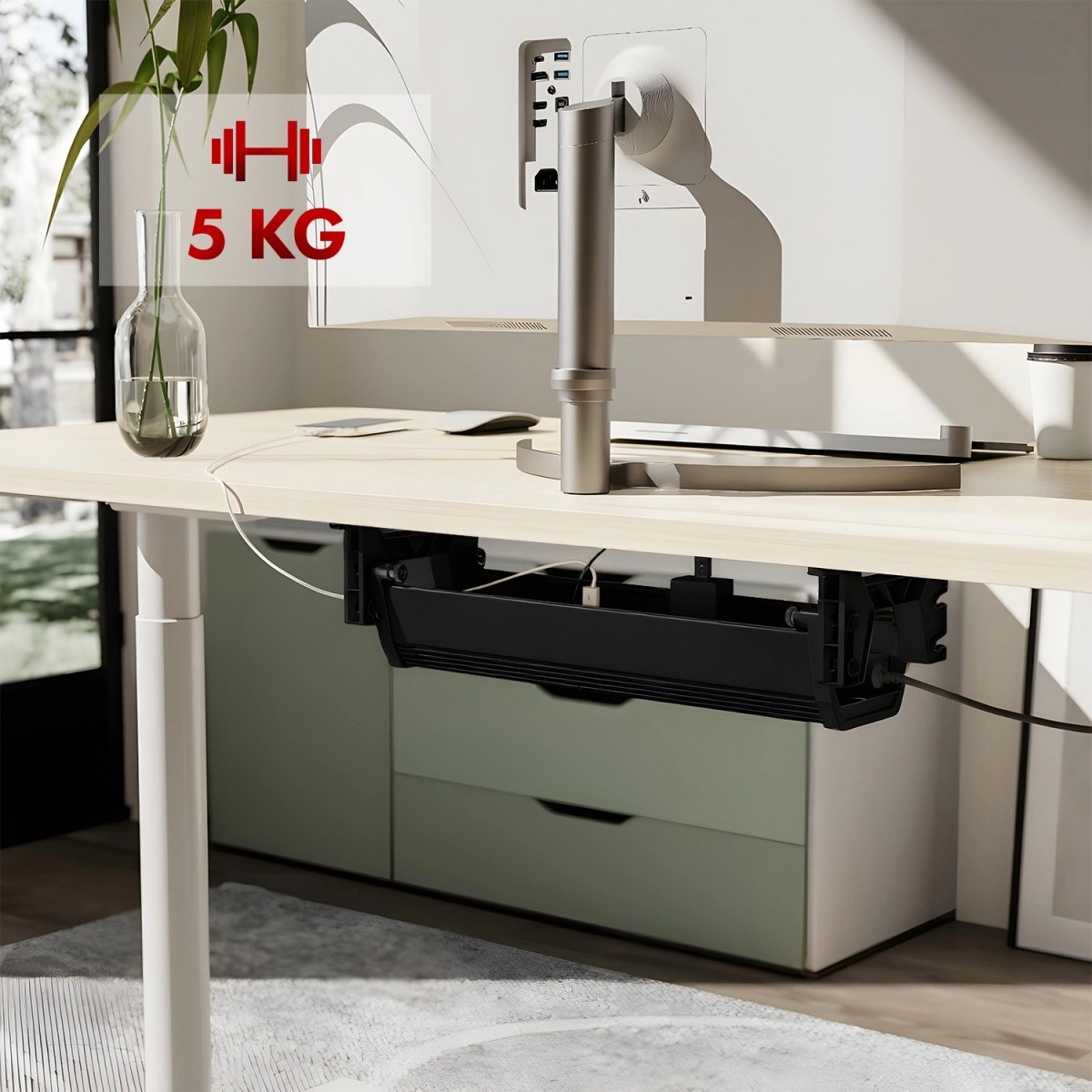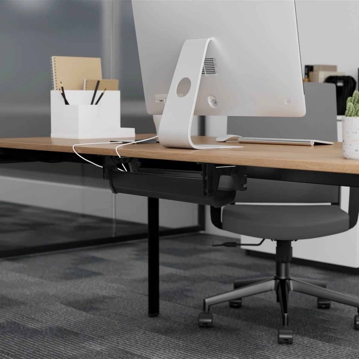 Az asztallap alatti csatorna szem elől tartja a hosszabbítót és a kábeleket, javítva a munkahely esztétikáját és biztonságát.