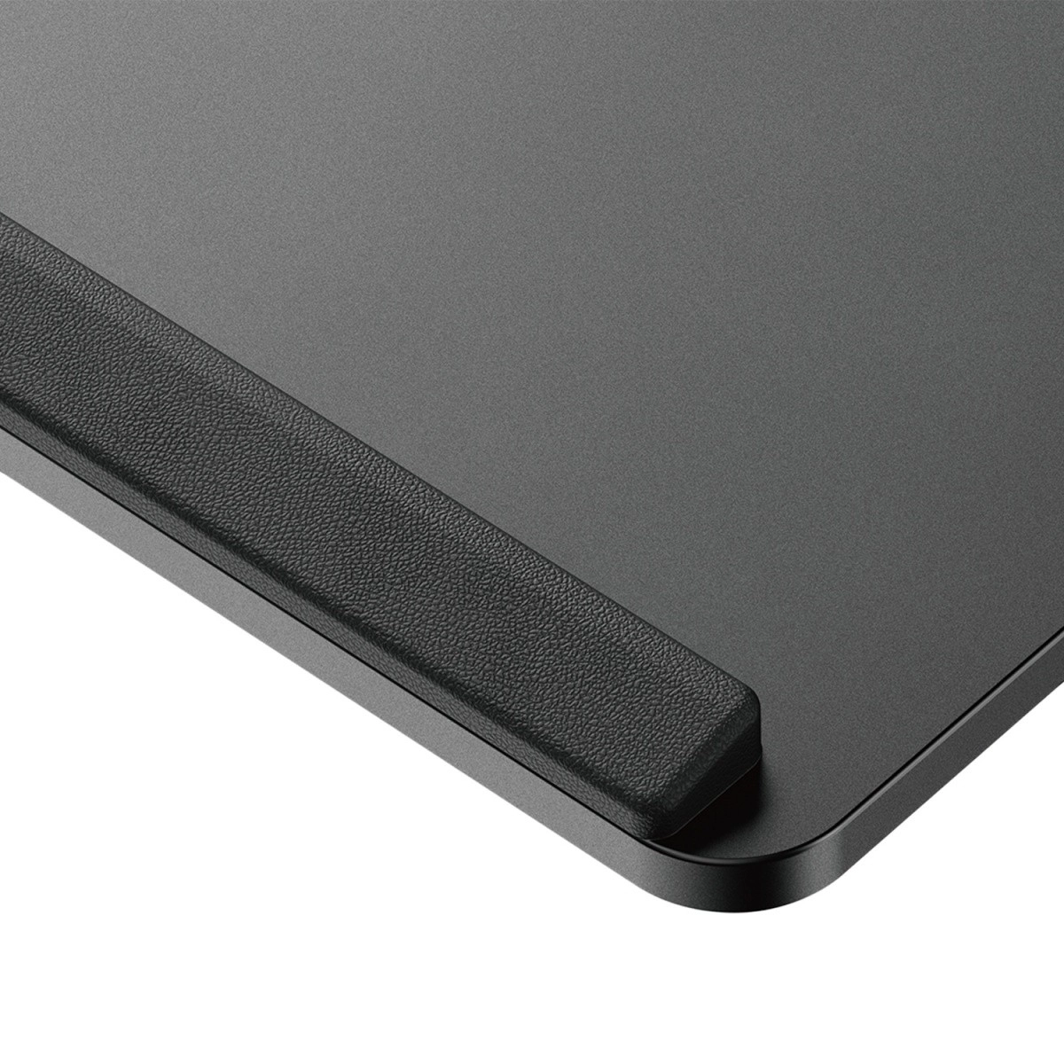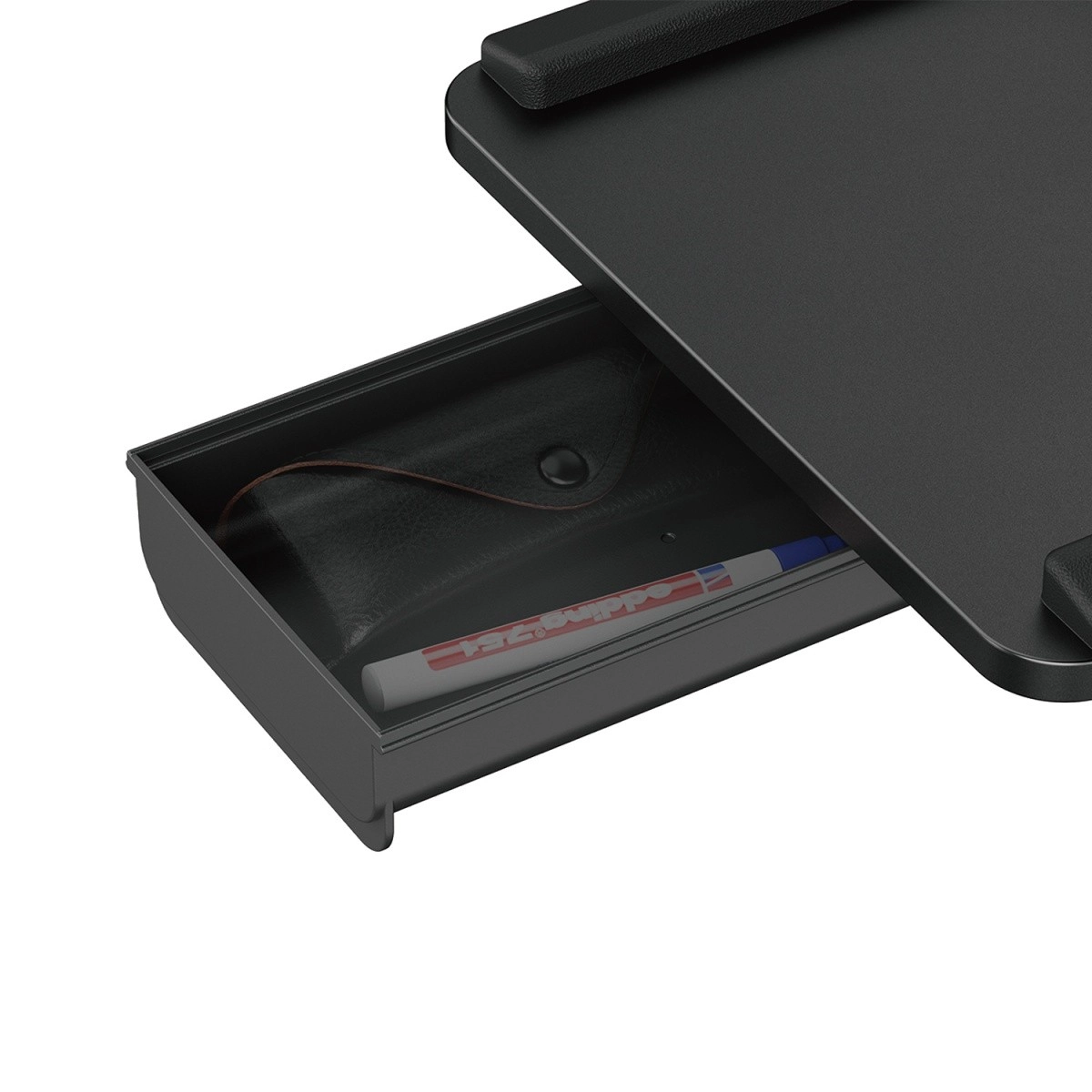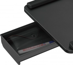 Az integrált oldalsó kihúzható rekesz apró kiegészítőknek ad helyet, a megemelt szegélyek pedig megakadályozzák a billentyűzet vagy egér leesését.