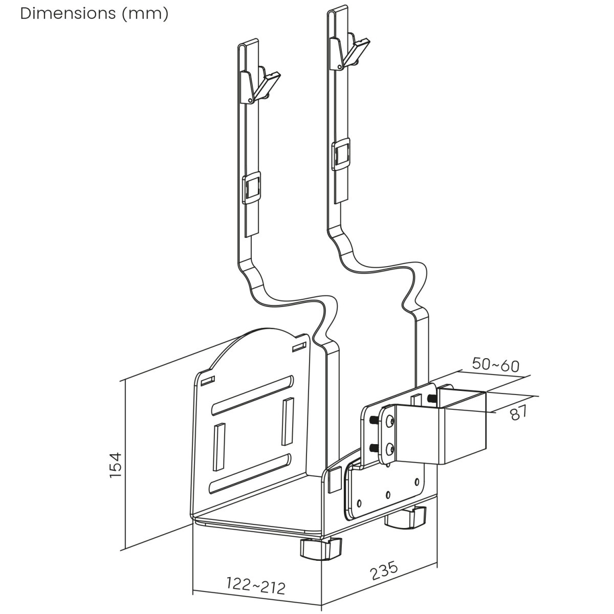 Univerzális asztali PC tartó, amely helyet takarít meg és rendezettséget biztosít a munkahelyen. Lehetővé teszi a falra vagy oszlopra szerelést, és a masszív acélszerkezetnek valamint az állítható hevedereknek köszönhetően biztonságosan tartja a gépházat. A széles mélységállítási tartomány kompatibilitást biztosít a legtöbb toronyházzal, míg a legfeljebb 10 kg teherbírás megbízható tartást ad vibráció esetén is.