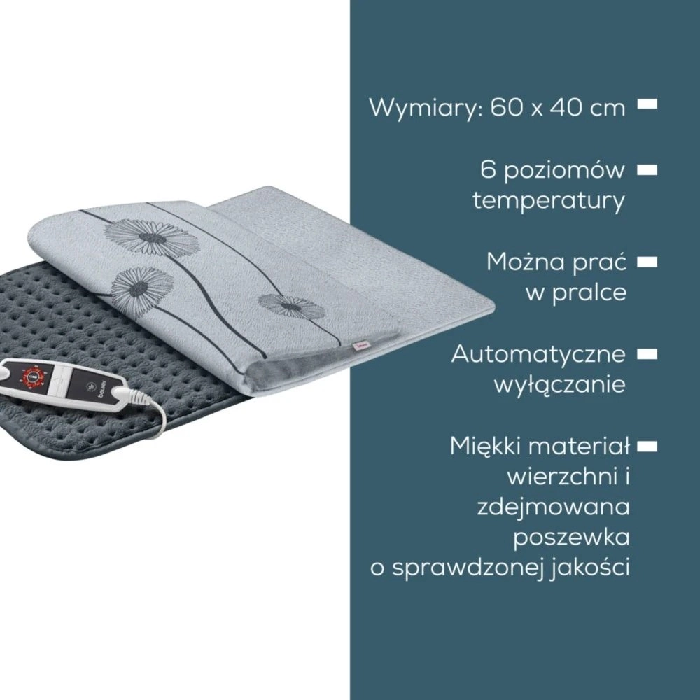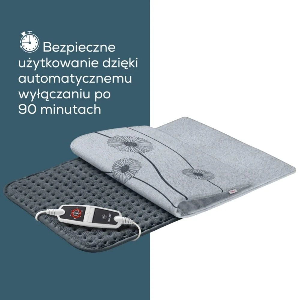 A párna puha, légáteresztő anyagból készült, amely kellemes tapintású. Biztonságáról a Beurer biztonsági rendszer gondoskodik folyamatos hőmérséklet-ellenőrzéssel és 90 perc utáni automatikus kikapcsolással.