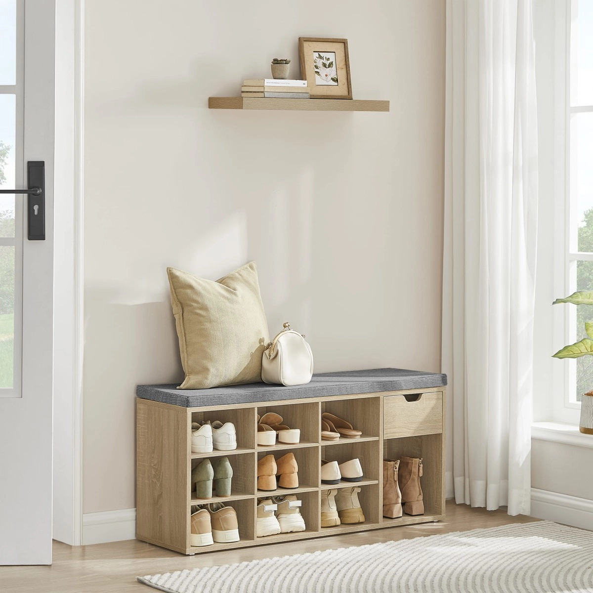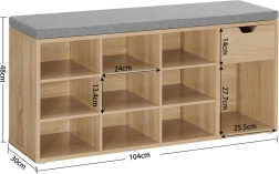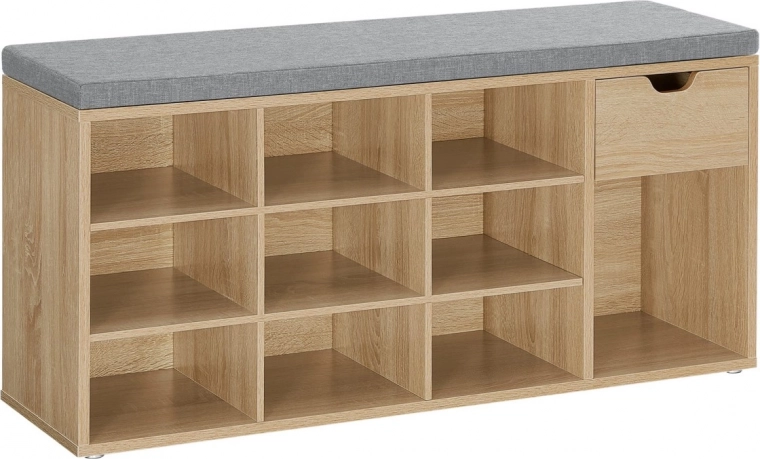 A felső lapon puha, szürke ülőke található kb. 4,5 cm vastagsággal, amely a szekrénytesthez tépőzárral rögzül – így könnyen levehető és tisztítható. Belül 10 mély polc kapott helyet akár kb. 44-es méretű cipőknek, valamint egy praktikus rekesz apróságoknak. Minden polc legfeljebb 10 kg terhet bír, a szekrény összesített teherbírása 200 kg.