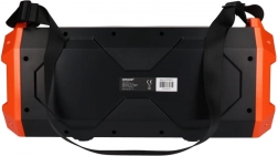 A praktikus oldalsó panel áttekinthető kijelzővel könnyű kezelést biztosít. A beépített 2000 mAh-s akkumulátor akár 5 órányi lejátszást nyújt, és körülbelül 3 óra alatt teljesen feltölthető. A csomag része a vállpánt a kényelmes hordozáshoz. A strapabíró fekete kivitel narancssárga elemekkel stílusos és modern megjelenést ad.