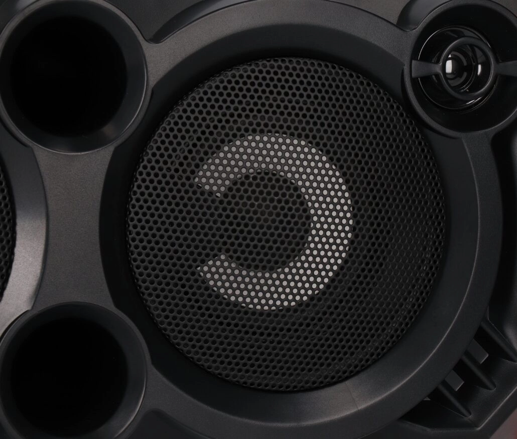 A Bass reflex kialakításnak és a legfeljebb 100 W zenei teljesítménynek (3 200 W P.M.P.O.) köszönhetően hangosan, telt hangzással és erőteljes basszussal szól. Az ekvalizer lehetővé teszi a magas és mély hangok beállítását, így igényeid szerint finomíthatod a hangzást. A karaoke funkció 6,5 mm-es mikrofonbemenettel és külön echo-effekt vezérléssel garantálja a bulihangulatot, melyet a többszínű LED háttérvilágítás fokoz.