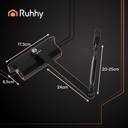 Univerzális RUHHY ajtócsukó 40–65 kg szárnytömeghez, amely biztosítja a finom és halk záródást csapkodás nélkül. A kétoldali szerelhetőségnek (jobbos és balos ajtókhoz) és a kettős erő- és sebességszabályozásnak köszönhetően védi a zsanérokat, javítja a záródást, a hő- és a hangszigetelést, valamint növeli a kényelmet és a biztonságot otthonokban, irodákban és kereskedelmi terekben.