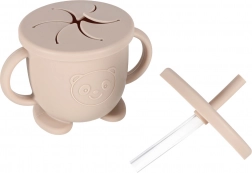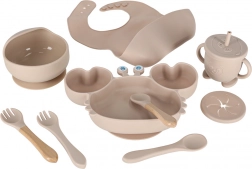 Ez a praktikus, puha szilikonból készült készlet mindent tartalmaz, amire a kisgyermekek mindennapi etetéséhez szükség van: rák alakú tányér három rekesszel, tapadókorongos tálka, pohár két tetővel (köztük szívószálas tető), négy evőeszköz és állítható zsebes előke. A tapadókorongok a tányéron és a tálkán megakadályozzák a felborulást és az elcsúszást, míg a rekeszek segítenek elkülöníteni az egyes adagokat.