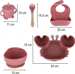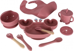 Teljes szilikon étkészlet babáknak és totyogóknak rákos tányérral, tapadókorongos tállal, kétféle tetővel és szívószállal ellátott bögrével, evőeszközökkel és praktikus szilikon előkével zsebbel. BPA-mentes, puha élelmiszeripari szilikon, erős tapadókorongok a felborulás ellen és könnyű karbantartás – ideális a önálló étkezéshez.