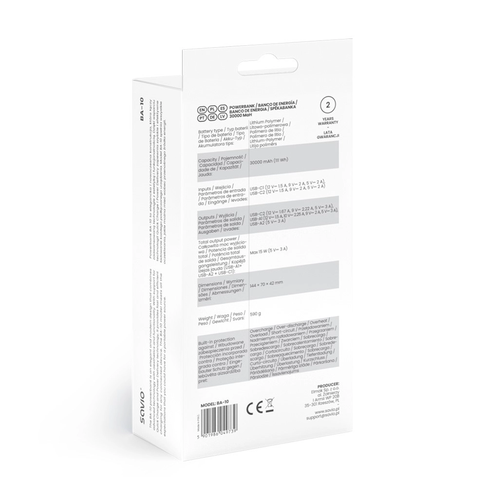 Megbízható powerbank 30000 mAh kapacitással, több napos üzemidőhöz utazás közben. Támogatja a gyorstöltést (Quick Charge és Power Delivery), lehetővé teszi akár három eszköz egyidejű töltését, és fejlett biztonsági funkciókkal védi készülékeidet.