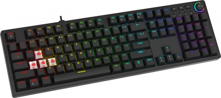 A teljes méretű kialakítás numerikus résszel és multimédiás billentyűkkel maximális funkcionalitást nyújt munkához és szórakozáshoz. A praktikus multifunkciós tárcsa megkönnyíti a hangerő és a háttérfény intenzitásának gyors állítását bonyolult gyorsbillentyűk nélkül. Tartós ABS kupakok, fonott USB-A/USB-C kábel, valamint mellékelt eszközök a billentyű- és kapcsolócseréhez egészítik ki az átgondolt felszereltséget.