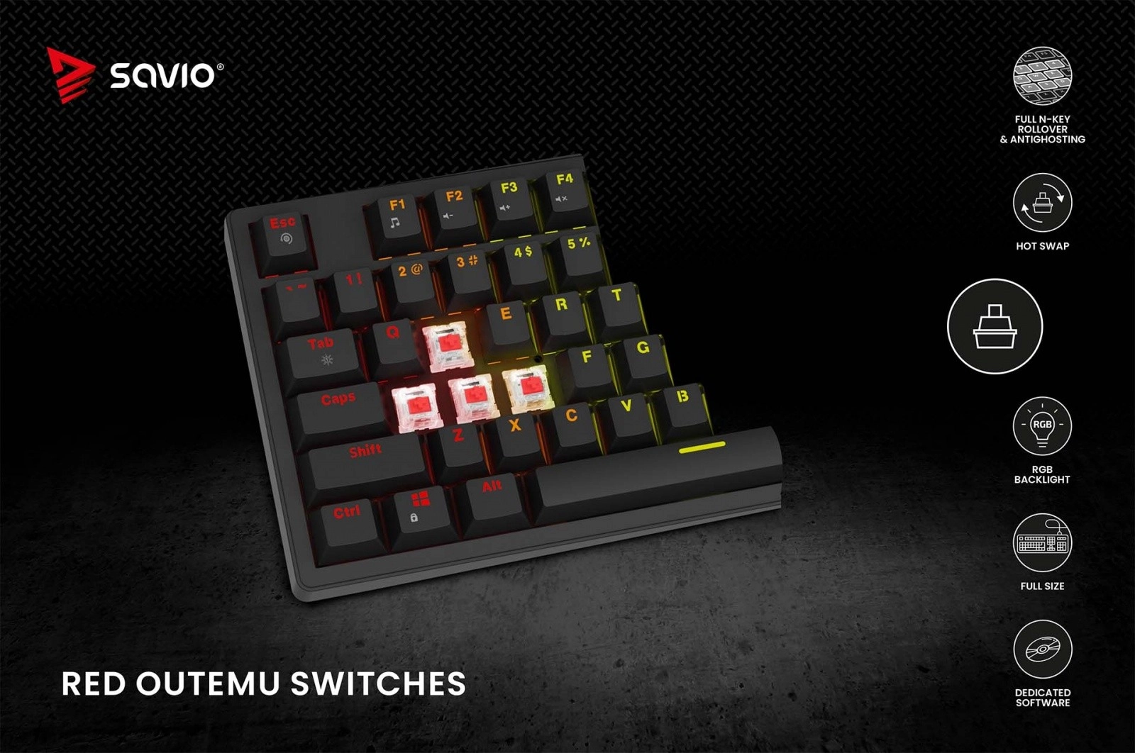 A teljes méretű Savio STYX mechanikus billentyűzet az ergonomikus, mindennapi gépelést ötvözi a gamer teljesítménnyel. A OUTEMU RED lineáris kapcsolók alacsony működtetési erővel és csendes járással gyors reakciót és folyamatos, sima gépelést garantálnak – ideális kompetitív játékhoz és hosszú szövegekhez is. Akár 50 millió leütés élettartammal a nagy igénybevételre készült.