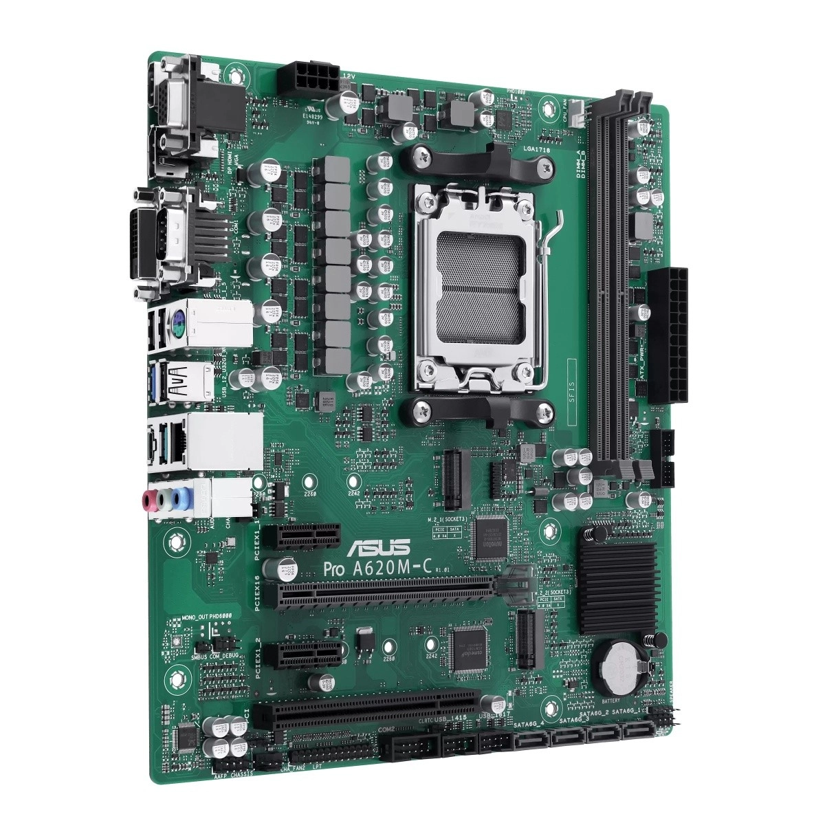 Az ASUS PRO A620M-C-CSM vállalati alaplap AM5 foglalattal megbízható működést, fokozott biztonságot és könnyű felügyeletet kínál. Támogatja a DDR5-öt, két M.2 PCIe 4.0 foglalatot, a USB 3.2 Gen 2 Type‑C-t, valamint eszközöket a hatékony üzemeltetéshez vállalati környezetben.