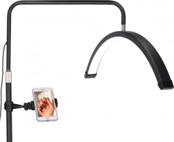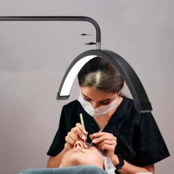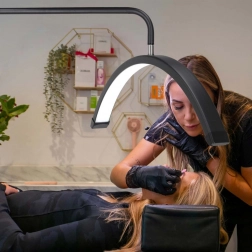 Az ívelt LED fej (64 cm) egyenletesen világítja meg a munkafelületet éles árnyékok nélkül – ideális a precíz munkához szempillán, szemöldökön és körmön.