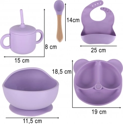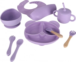 A teljes szilikon étkészlet gyermekeknek elegáns lila színben megkönnyíti az első lépéseket az önálló étkezés felé. Minden szükséges elemet tartalmaz: osztott tányér tapadókoronggal, tál tapadókoronggal, tanulópohár fedéllel és szívószállal, 2 kanál és 2 villa, valamint egy állítható zsebes előke. BPA-mentes, biztonságos szilikonból készült, mosogatógépben és mikrohullámú sütőben is használható.