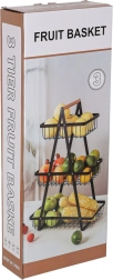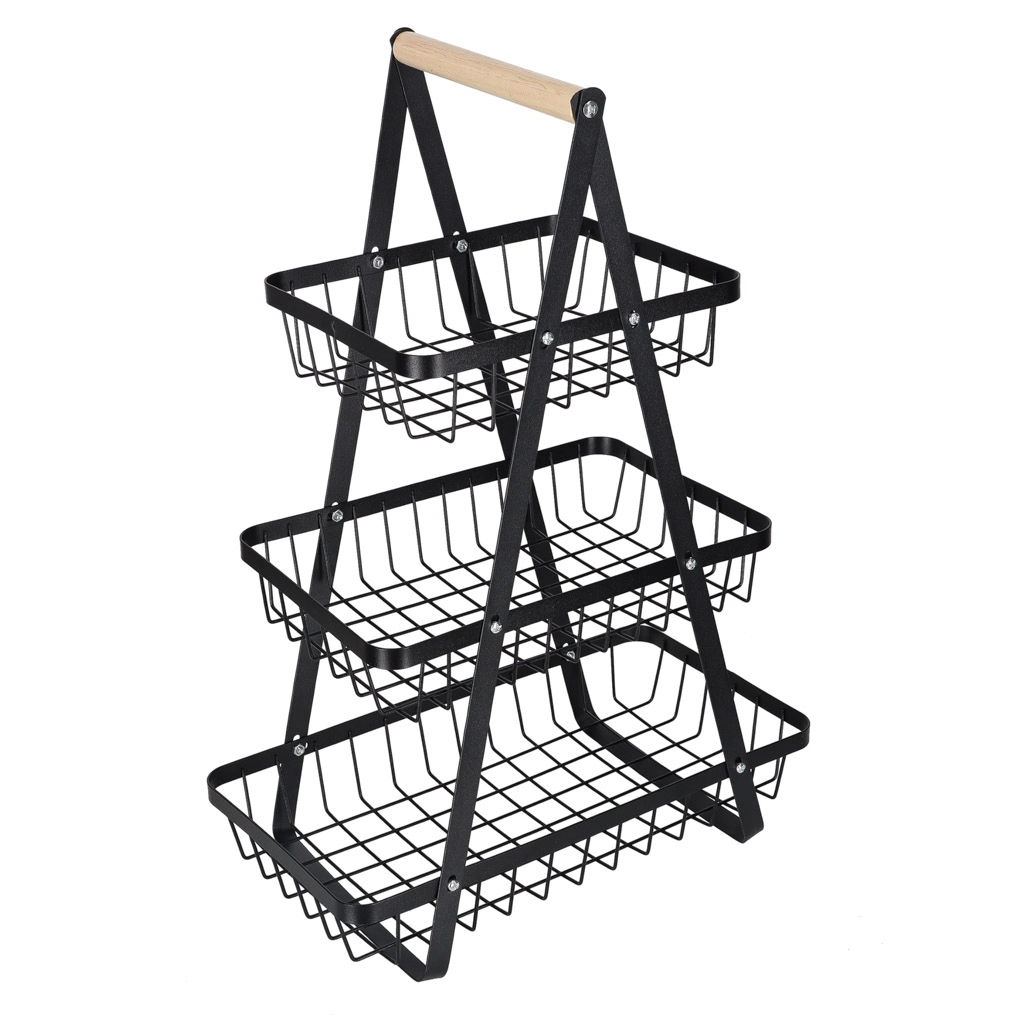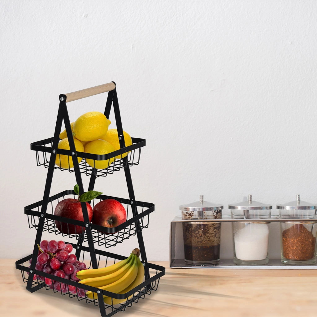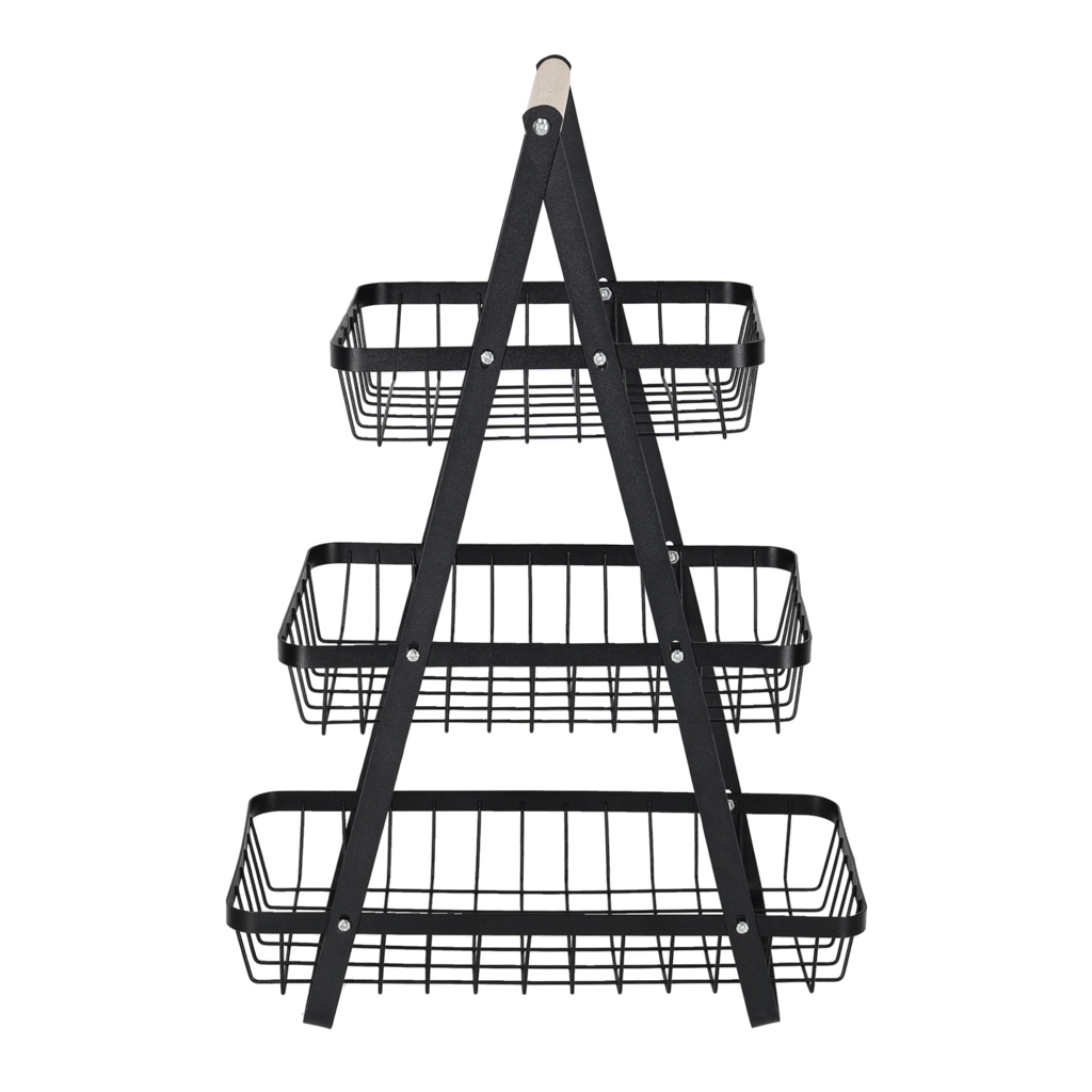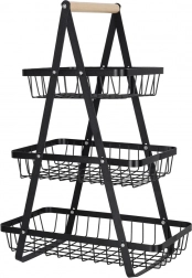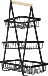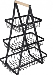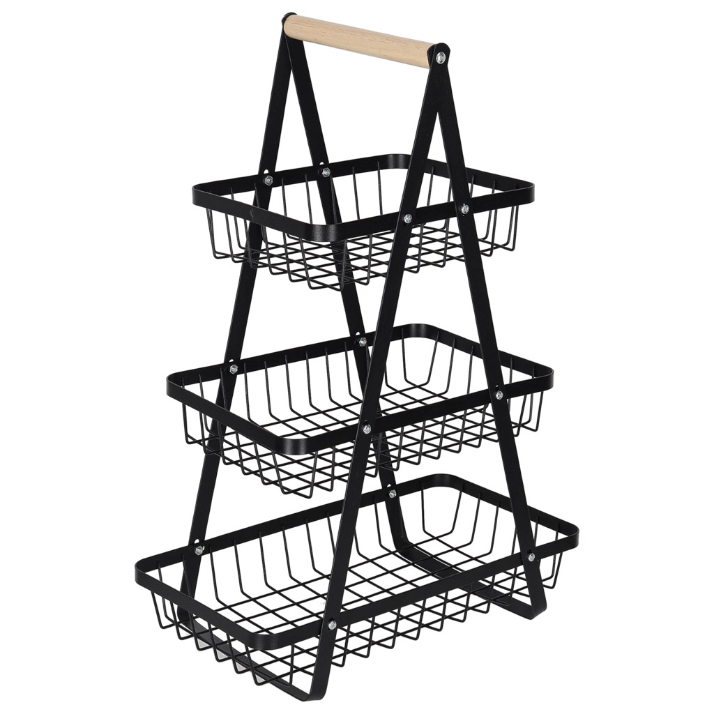 Stílusos háromszintes gyümölcskosár tartós fémből, fa fogantyúval, amely helyet takarít meg a konyhapulton és rendezetten tartja a konyhát. A három tágas kosár nyitott drótszerkezete biztosítja a levegő keringését, így a gyümölcs és zöldség tovább friss marad. Ideális péksüteményekhez, rágcsálnivalókhoz vagy fürdőszobai kiegészítőkhöz is.