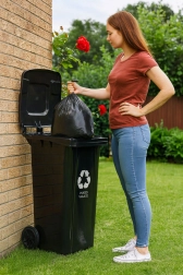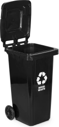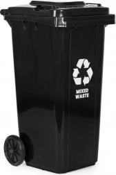 Praktikus és tartós, 120 l űrtartalmú HDPE szemetes vegyes hulladékhoz, mindennapi használatra otthonra és vállalkozásoknak. Kínálja a UV-sugárzással és vegyszerekkel szembeni ellenállást, eső- és szagszivárgást gátló tömített fedelet, gumírozott kerekeket fém tengellyel az egyszerű mozgatáshoz, valamint stabilizáló lábakat a csúszás ellen. Megfelel az EN 840 szabványnak és kompatibilis a kommunális begyűjtő járművekkel.