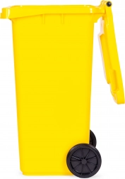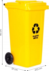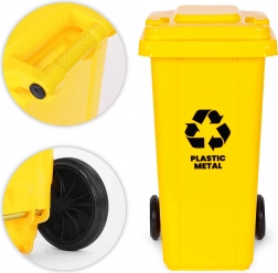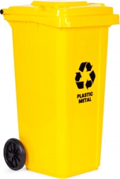 Megbízható, 120 l-es sárga hulladéktároló műanyag és fém szelektálásához, amely rendet és tisztaságot biztosít otthonok, telephelyek és irodák környezetében. A kiváló minőségű HDPE test ellenáll a UV-sugárzásnak, a vegyszereknek és a mechanikai sérüléseknek. A zárható/tömítetten záródó fedél véd az esőtől és a szagok kiáramlásától, míg a masszív gumírozott kerekek és az ergonomikus fogantyúk megkönnyítik a mozgatást teljes terhelés mellett is.