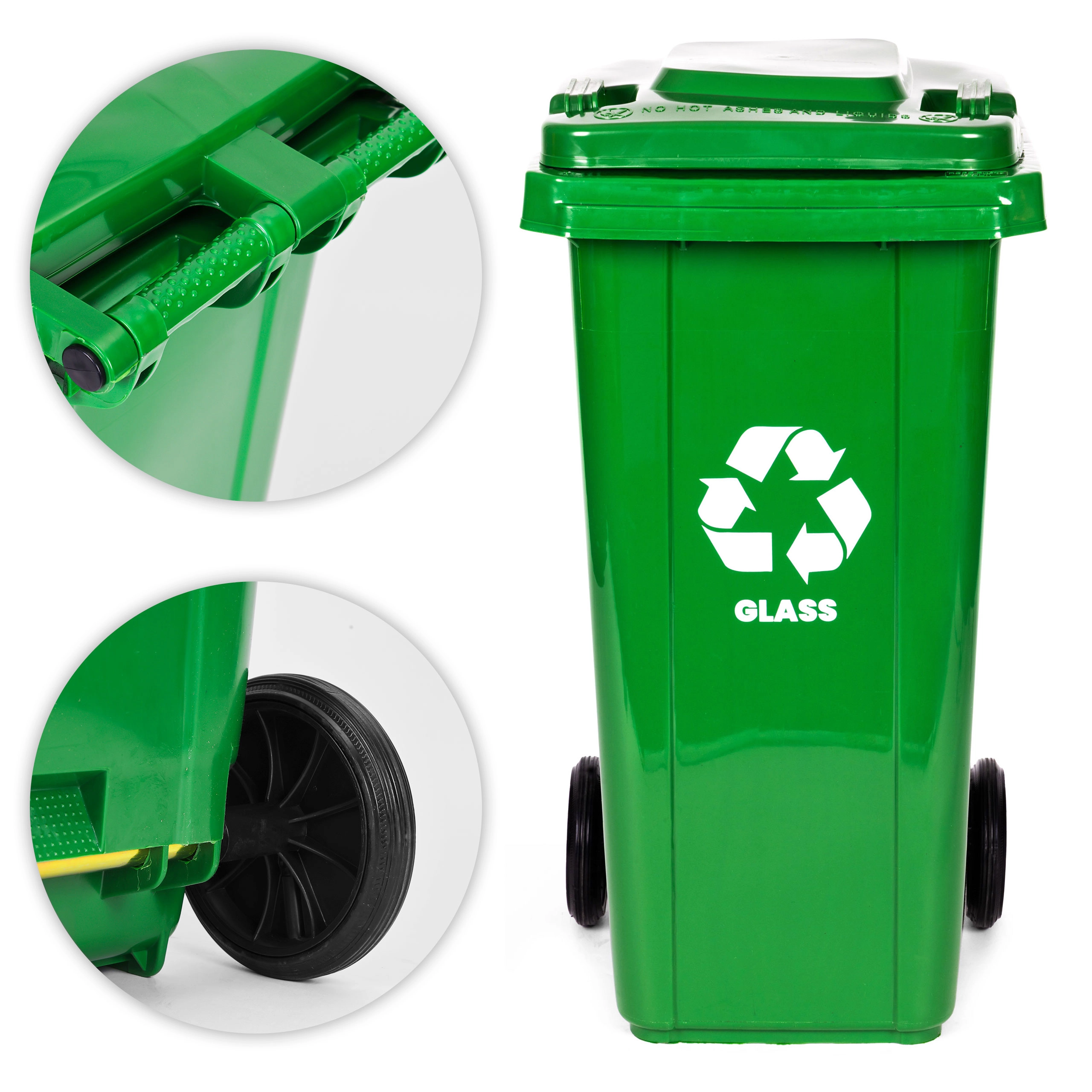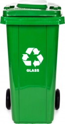Praktikus és tartós, 120 l űrtartalmú üvegválogató konténer UV-álló HDPE anyagból, vegyszerekkel és mechanikai sérülésekkel szemben ellenálló kivitelben. A gumírozott kerekek és az ergonomikus fogantyú megkönnyítik a mozgatást, a tömített fedél pedig megóv az esőtől és a szagoktól. A csúszásgátló lábak növelik a stabilitást csúszós felületen. Otthoni és üzleti felhasználásra egyaránt alkalmas, a kommunális gyűjtéssel EN 840 szerint kompatibilis, valamint ISO9001, ISO14001, ISO45001 tanúsítással rendelkezik.