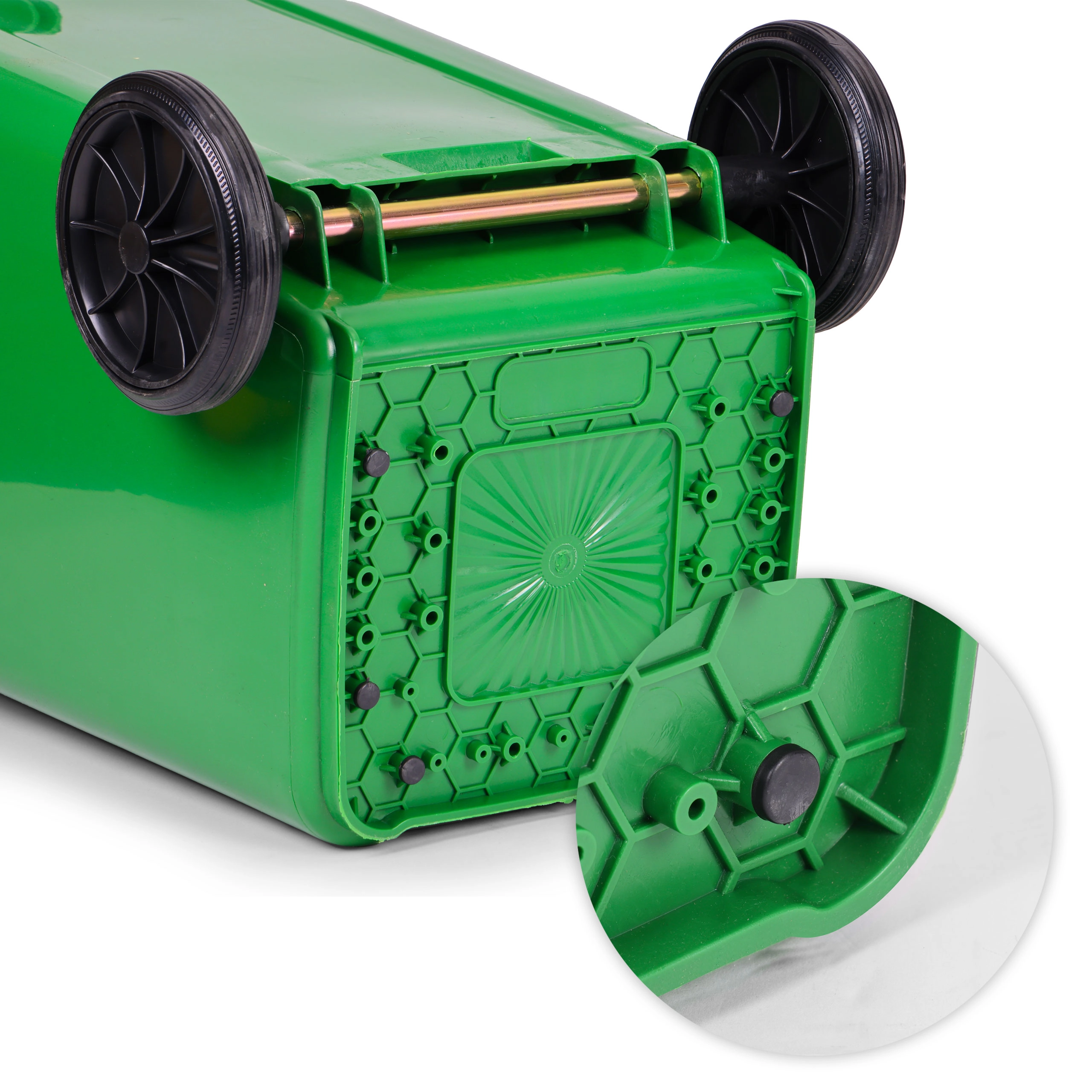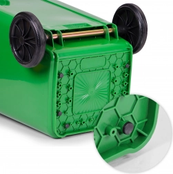 A kényelmes áthelyezést a fém tengelyű gumírozott kerekek és a ergonomikus fogantyúk csúszásgátló profillal segítik. A stabilizáló lábak csökkentik az elmozdulást nedves felületen, és védik a padlót a karcolásoktól. Az edény teljes mértékben kompatibilis a kommunális gyűjtőjárművekkel az EN 840 szerint, a ISO9001, ISO14001, ISO45001 szabványoknak megfelelve magas szintű minőségi és biztonsági követelményeket teljesít.