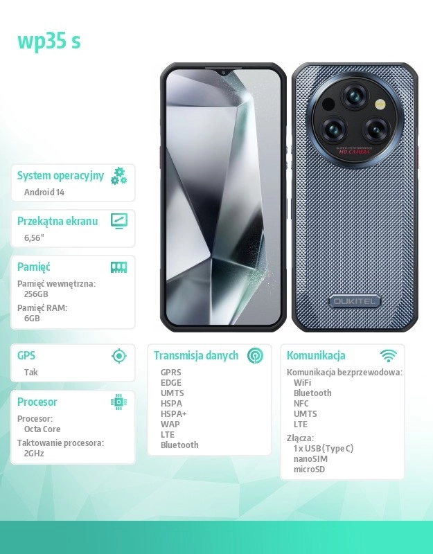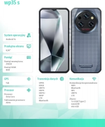 Az OUKITEL WP35S egy strapabíró okostelefon igényes körülményekhez, IP68/IP69K és MIL‑STD‑810H tanúsítvánnyal. Óriási, 11 000 mAh‑s akkumulátort, gördülékeny teljesítményt nyújtó MediaTek Helio G85 chipet, 6 GB RAM‑ot és 256 GB tárhelyet kínál, amely akár 2 TB‑ig bővíthető. A 6,56" IPS kijelzőt Corning Gorilla Glass 5 védi, a 48 + 8 (éjjellátó) + 2 MP hármas kamera mellé NFC, Bluetooth 5.0 és pontos GPS/GLONASS/Beidou/Galileo navigáció társul.