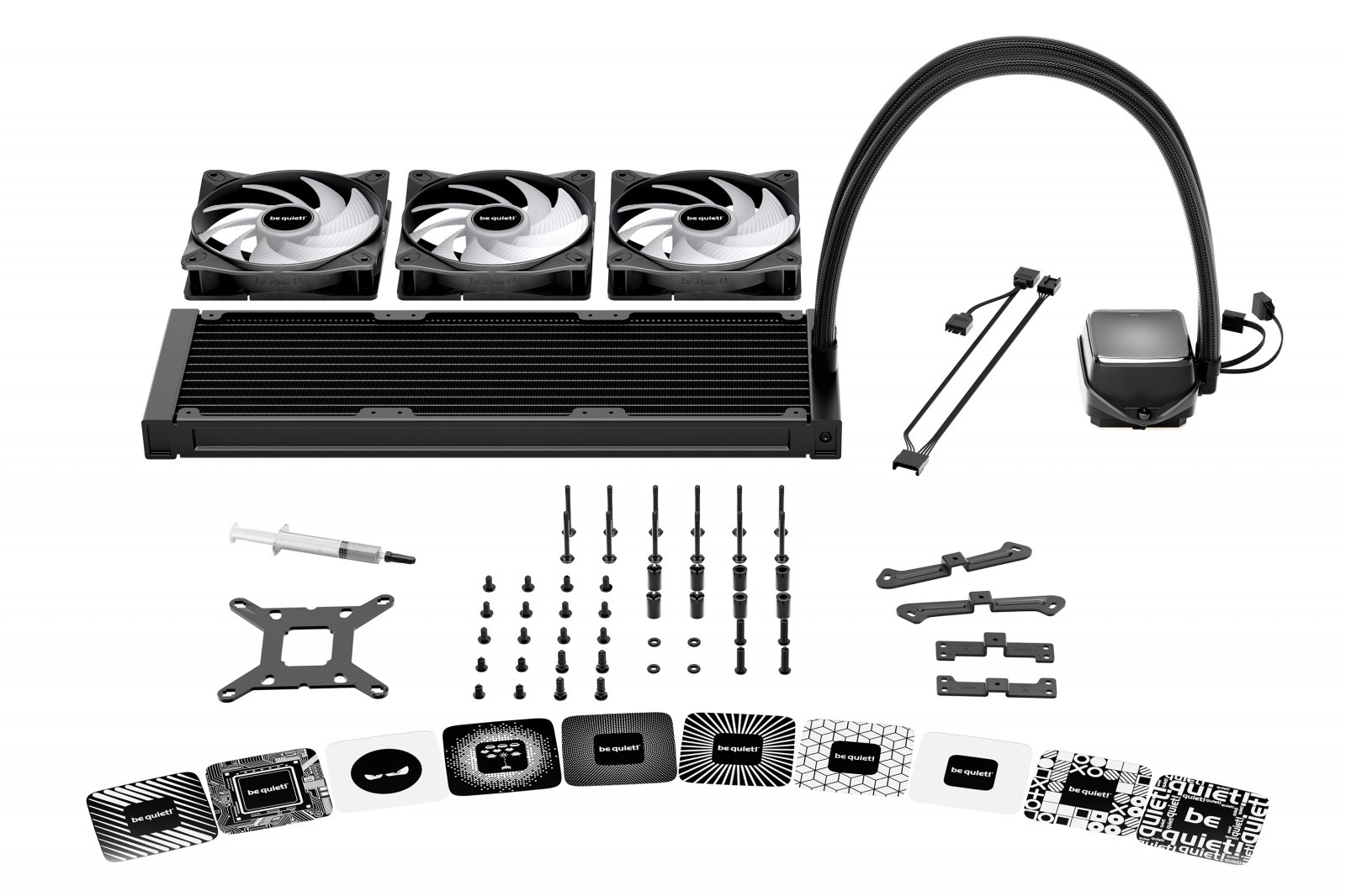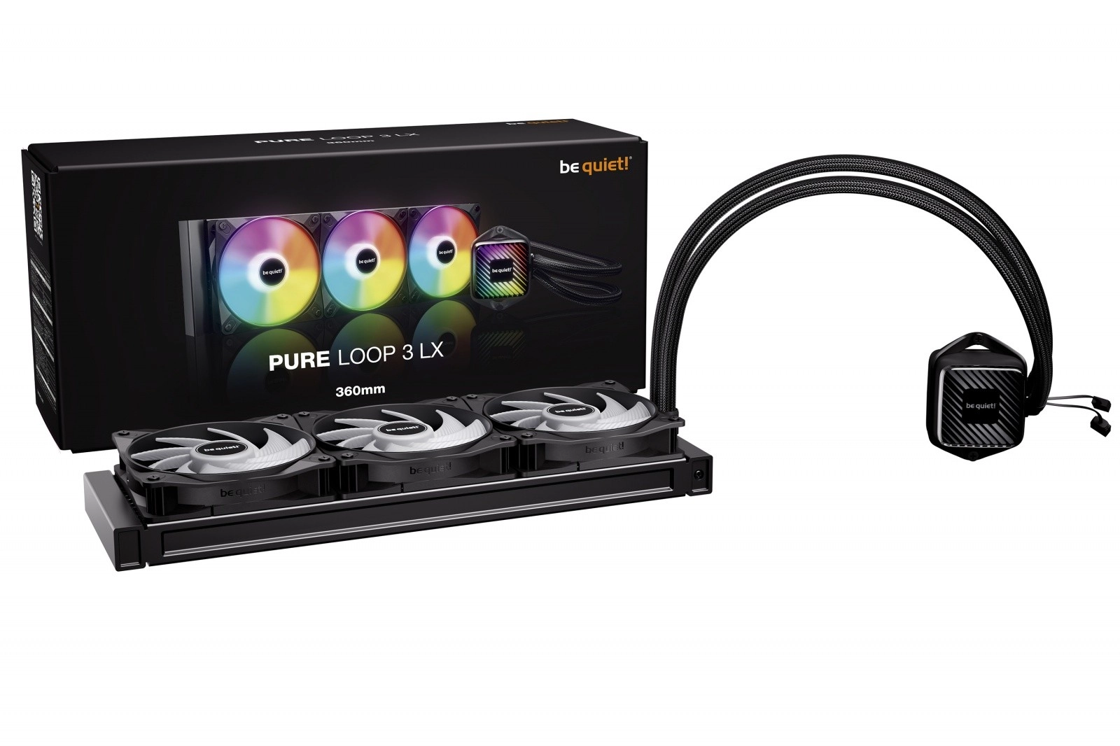 A Pure Loop 3 LX 360 mm a kifinomult dizájnt maximális hűtéssel párosítja. A stílusos ARGB blokk 10 mellékelt betéttel széleskörű testreszabást kínál. A három Light Wings LX 120 mm PWM high-speed ventilátor 16 LED-del és áramlásra optimalizált lapátokkal magas teljesítményt és alacsony zajszintet biztosít, míg a tölcsér alakú kifúvók maximalizálják a légáramot a sűrű bordázatú 360 mm-es radiátoron.