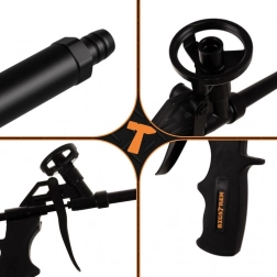 A tartós teljesen fém test megbízhatóságot és hosszú élettartamot nyújt intenzív használat mellett is. Az ergonomikus, csúszásmentes felületű markolat kényelmes fogást biztosít és minimalizálja a fáradtságot hosszabb munka során. A pisztoly kompatibilis a legtöbb szabványos PU hab patronnal.