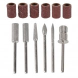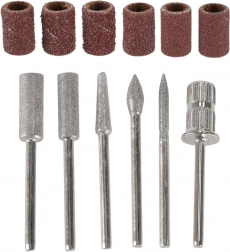 - Gazdag felszereltség: 6 fém csiszolófej (hegyes, hengeres, kúpos, gömb, tű alakú, szár csiszológyűrűkhöz) + 6 csiszolóhüvely különböző szemcsemérettel.