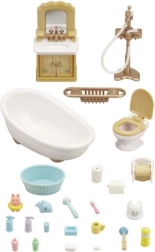 Add meg a SYLVANIAN FAMILIES házikónak az otthonos hangulatot ezzel a teljes, rusztikus stílusú fürdőszobaszettel. A készlet tartalmaz egy kádat, mosdót tükörrel és szekrénnyel, zuhanyt és WC-t, amelyeket praktikus kiegészítők egészítenek ki (szennyeskosár, szappan, flakonok, kefék). Ideális a kreatív játékhoz és a képzelőerő fejlesztéséhez. Figurák nem tartoznak a csomaghoz.