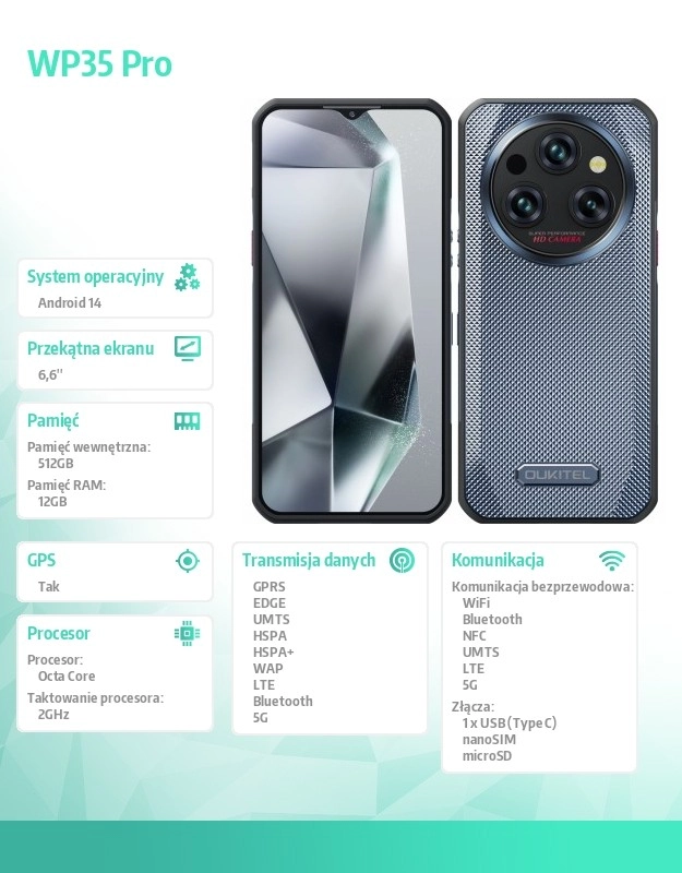 Olyan telefont keres, amely bírja a kemény igénybevételt és a hosszú bevetéseket töltő nélkül? Az OUKITEL WP35 Pro 5G a masszív 11 000 mAh akkumulátort a kategóriában az egyik legvékonyabb strapabíró házzal ötvözi (15,2 mm). A 6,6" FHD+ Gorilla Glass 5 kijelző éles képet és karcállóságot biztosít, míg az 5G és a MediaTek Dimensity 6300 (8 mag, 2,2 GHz) chipkészlet folyamatos működést garantál.