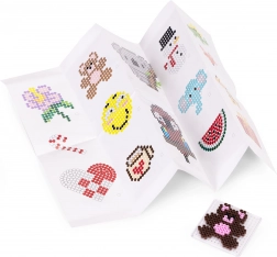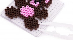 Átlátszó alaplapok különböző formákban, mellékelt sablonok és csipeszek segítik a gyöngyök pontos elhelyezését. A fedőpapír megóvja a mintát vasalás közben.