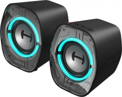 A megfontolt 10°-os dőlés javítja az irányíthatóságot és csökkenti az asztalról visszaverődő hangokat, az átlátszó, tükröződő elemek kiemelik a futurisztikus dizájnt, a gumitalpak pedig stabilan a helyükön tartják a hangszórókat.