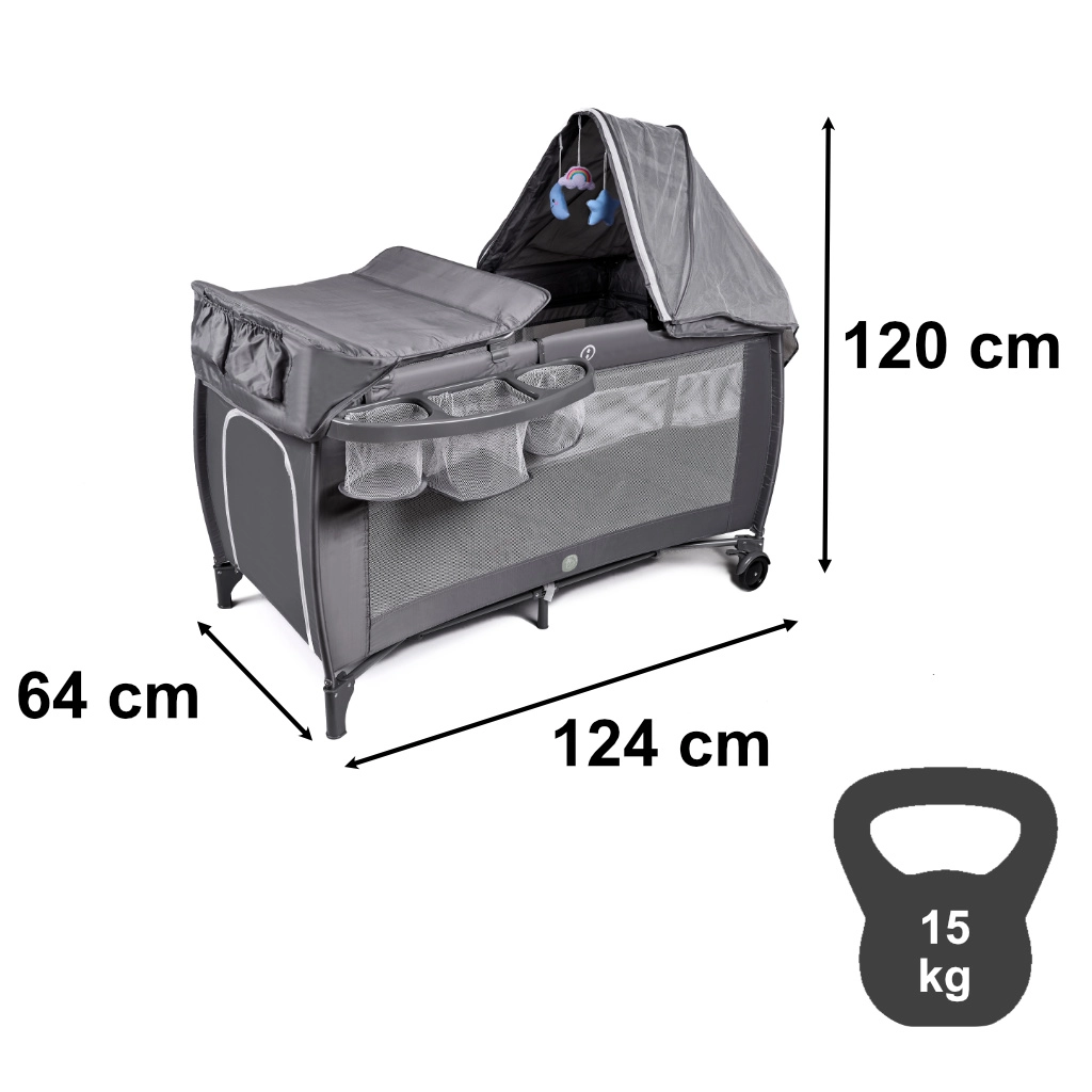 Ez a többfunkciós utazóágy a születéstől kb. 36 hónapos korig együtt nő gyermekével. A masszív X alakú váz és a két magassági szint biztonságot és kényelmet nyújt, míg a hálós panelek kiváló szellőzést és jó rálátást biztosítanak a babára. A tető szúnyoghálóval véd a rovarok ellen, a függő plüss játékok pedig lefoglalják a kicsit.