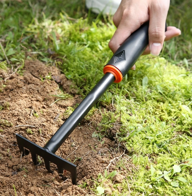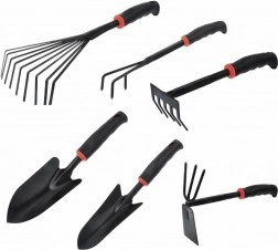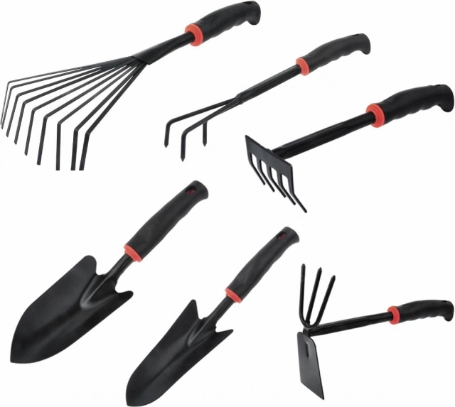 Akár 6 rendkívül hasznos kerti eszköz készlete. Ez minden becsületes földtulajdonos és kertész számára elengedhetetlen. A készlet tartalmaz két kerti lapátot, karmos gereblyét, karmos kapát és kis gereblyét. Az eszközök kompaktak és helytakarékosak, mégis nagyon funkcionálisak, és ugyanolyan jól működnek, mint teljes méretű társaik. Kényelmes ergonómikus fogantyúk puha műanyagból, amelyek magas kényelmet biztosítanak.